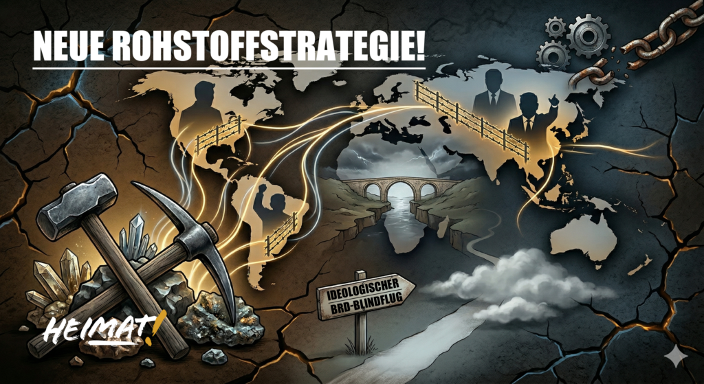 Grafik zur Rohstoffstrategie der Partei DIE HEIMAT mit Weltkarte, Bergbau-Symbolen und Wegweiser „Ideologischer BRD-Blindflug“.